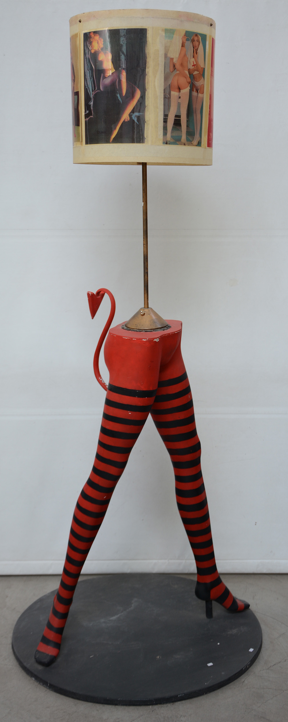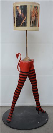 Lampada da terra a tre luci con fusto a gambe femminili in legno verniciato e paralume con figure femminili applicate. (difetti)