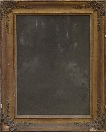 Specchiera in legno e pastiglia dorata decorata da fregi angolari con riccioli e fiori (cm 62x49) Secolo XIX (difetti e mancanze)