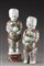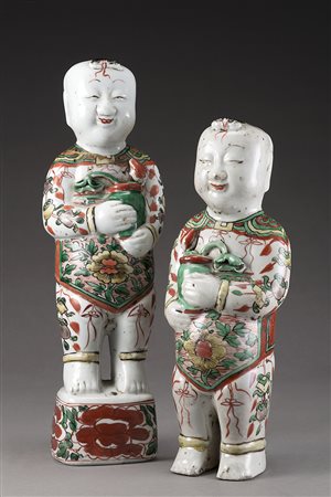 Coppia di statue raffiguranti fanciulli, in porcellana decorata a smalti della Famiglia Verde wucai (uno con restauro storico)
