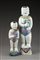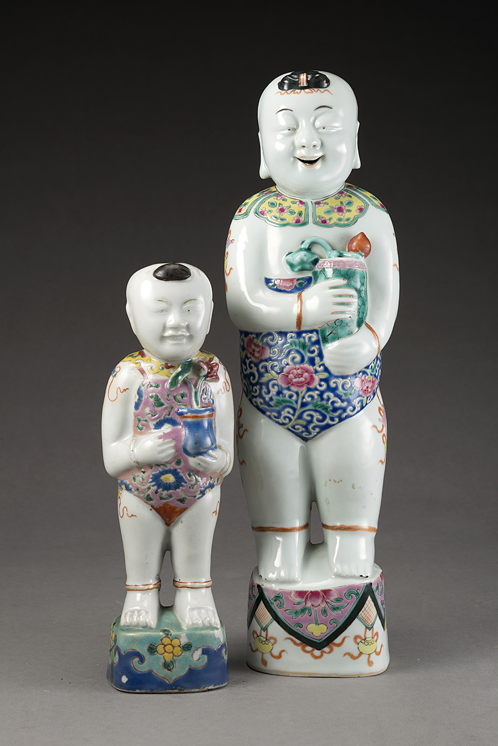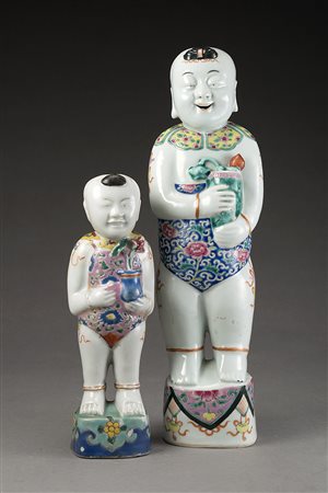 Due statue in porcellana raffiguranti fanciulli con in mano vasi fioriti, decorate a smalti della Famiglia Rosa fencai (una con restauro)