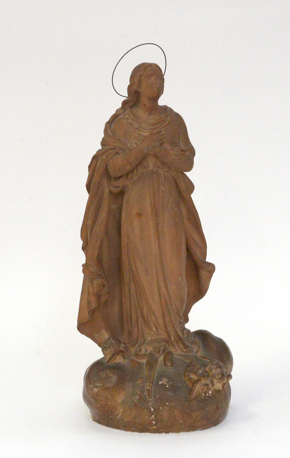 Scultura in terracotta raffigurante "Madonna dell'Apocalisse" (h cm 56) Firmata e datata 1888 alla base (mancanze e difetti)