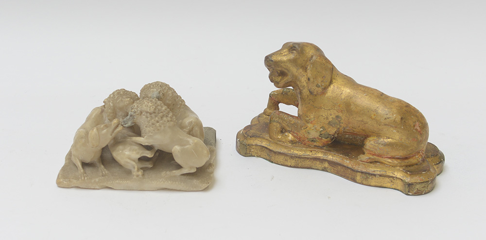 Lotto composto da una scultura in alabastro del secolo XIX raffigurante lotta tra cani e una lignea della fine del secolo XVIII (difetti)