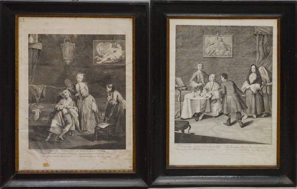 Pietro Longhi. Coppia di incisioni raffiguranti scene di interni (cm 53x40) Venezia, secolo XIX. In cornici dell'epoca (difetti)
