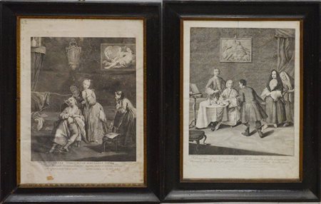 Pietro Longhi. Coppia di incisioni raffiguranti scene di interni (cm 53x40)...