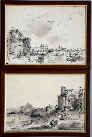Ignoto "Scorci con figure" coppia di acquerelli su carta (cm 20x29) In cornici