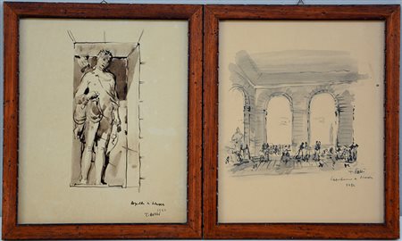 Tomaso Buzzi (Sondrio 1900 - Rapallo 1981) "Capodanno 1954 e Apollo 1952" coppia di bozzetti ad acquerello e china su carta (misure diverse) In cornici