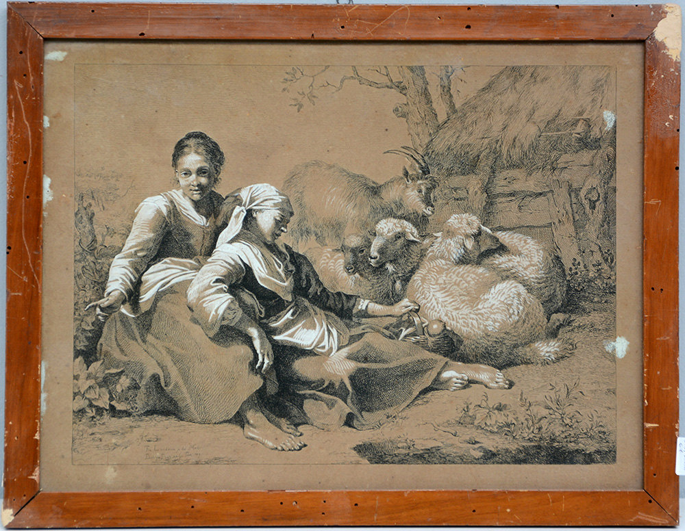 Francesco Londonio (Milano 1723 - 1783) "Paesaggio con armenti e contadine" incisione datata 1789 con interventi in biacca di epoca posteriore (cm 27x35) (difetti)