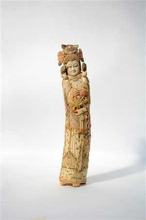 Scultura raffigurante imperatrice con fiori e volatili in avorio con dettagli a colori (h. 56 cm.)(difetti) Cina, inizio sec. XX