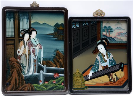 Due verrepaint raffiguranti eleganti dame in scene galanti, in cornice (misure diverse, misura max cm 53x38)(lievi difetti)