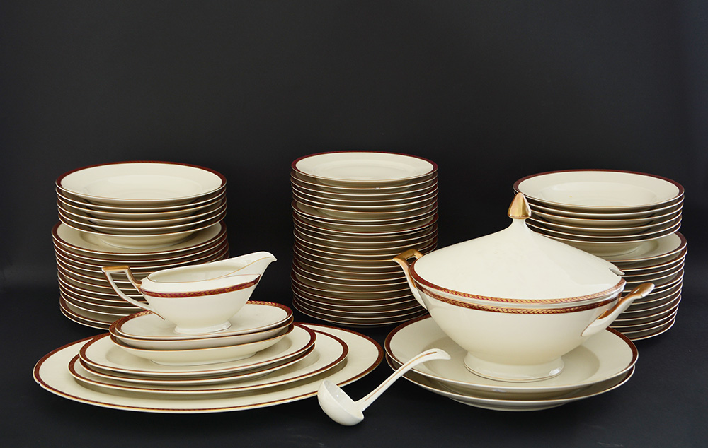 Manifattura tedesca Heinrich, servizio da tavola in porcellana con profilo a palmette composto da: dodici piatti fondi e ventiquattro piani, dodici piatti da dolce, sei piatti da portata ovali e due tondi, zuppiera, insalatiera e salsiera (difetti)