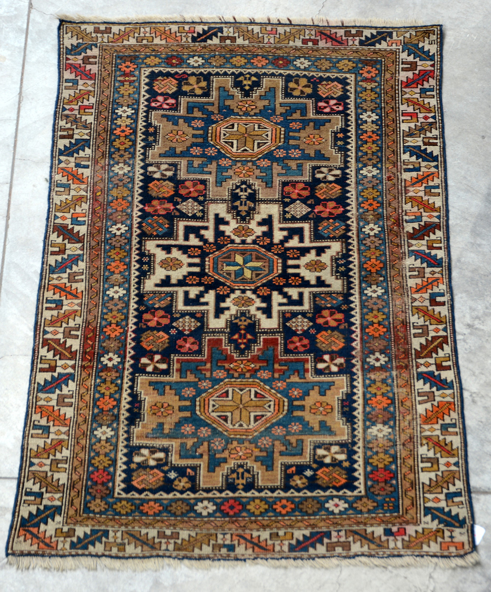 Tappeto Schirwan Lesghi, Caucaso inizio secolo XX. Decoro con tre croci di Sant'Andrea nei toni dell'azzurro, nocciola, bianco e blu su fondo blu notte (cm 134x87) (difetti e rapature)