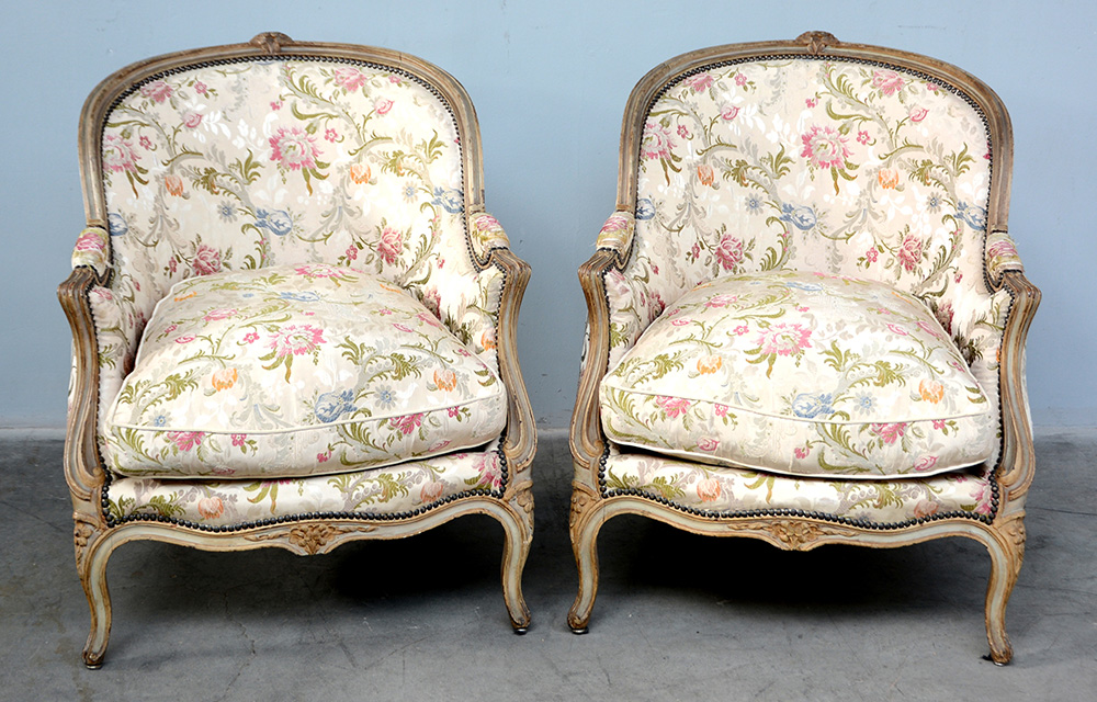 Coppia di poltrone a pozzetto in legno laccato, schienale e fascia intagliati a fiori. Gambe mosse (difetti e restauri alla lacca)