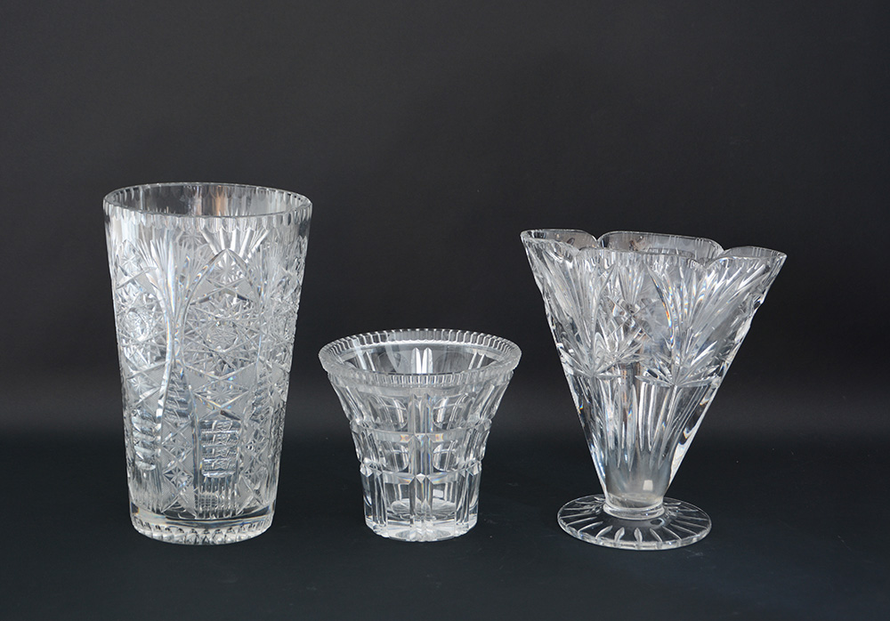 Lotto di tre vasi in cristallo sfaccettato (h max cm 30) (difetti)