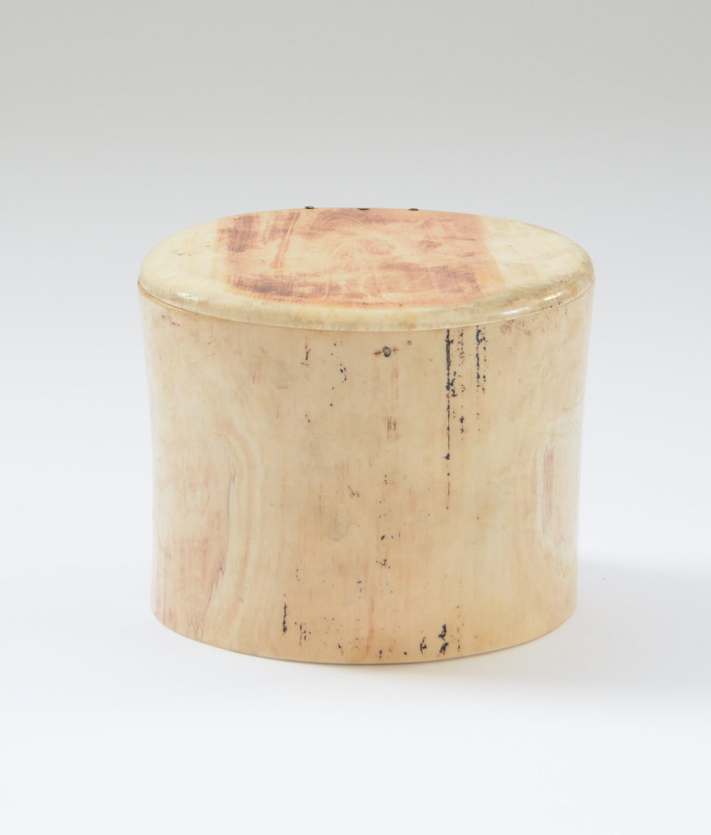 Scatola cilindrica in osso con coperchio incernierato, all'interno girali di foglie con nomi inscritti (h. cm 9) (difetti)