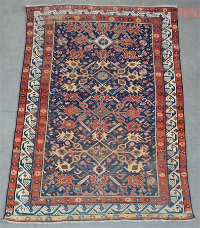 Tappeto Seichur, Caucaso seconda metà secolo XIX. Disegno a medaglioni con motivi reminescenti draghi nei toni del bianco e rosso alternati su fondo blu notte. Bordura “Cane che corre” su fondo bianco (cm 170x114 ) (difetti, restauri e rapature)