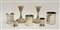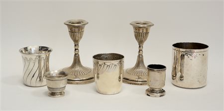 Lotto composto da due candelieri e cinque bicchieri di varie misure in argento (gr 480)