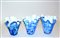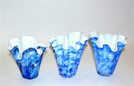 Lotto composto da tre vasi a fazzoletto in vetro a decoro marmorizzato nei toni del blu (h max cm 22)