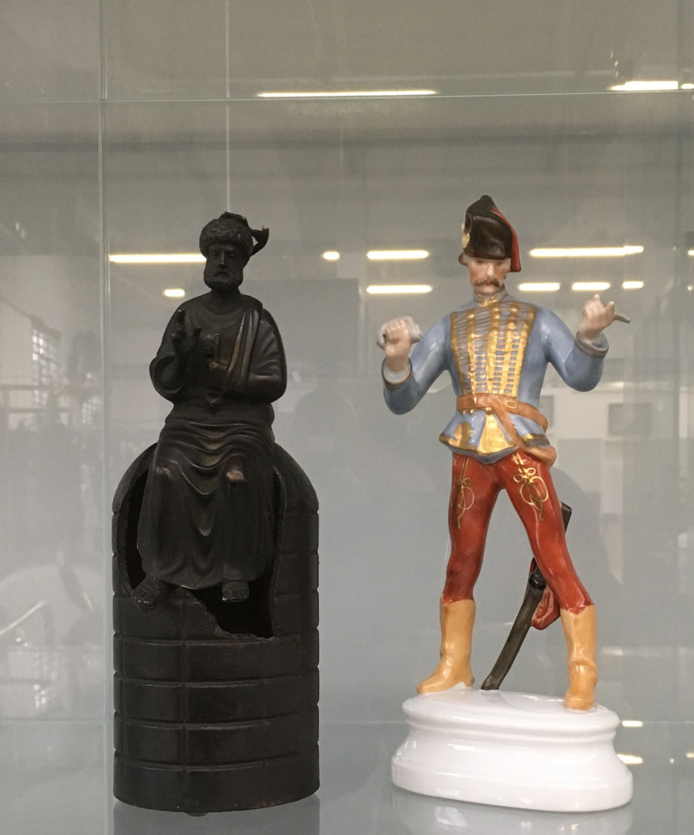 Lotto composto da una scultura in bronzo raffigurante San Pietro ed una in porcellana di Herend raffigurante un Ussaro (h max cm 23)