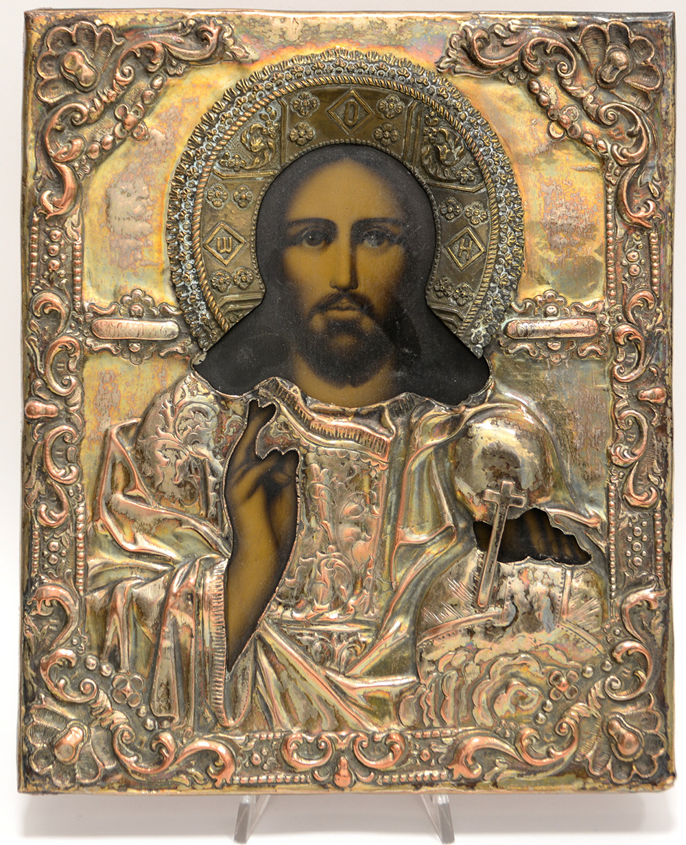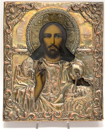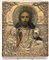 Icona con riza in rame argentato raffigurante Salvador Mundi (difetti)