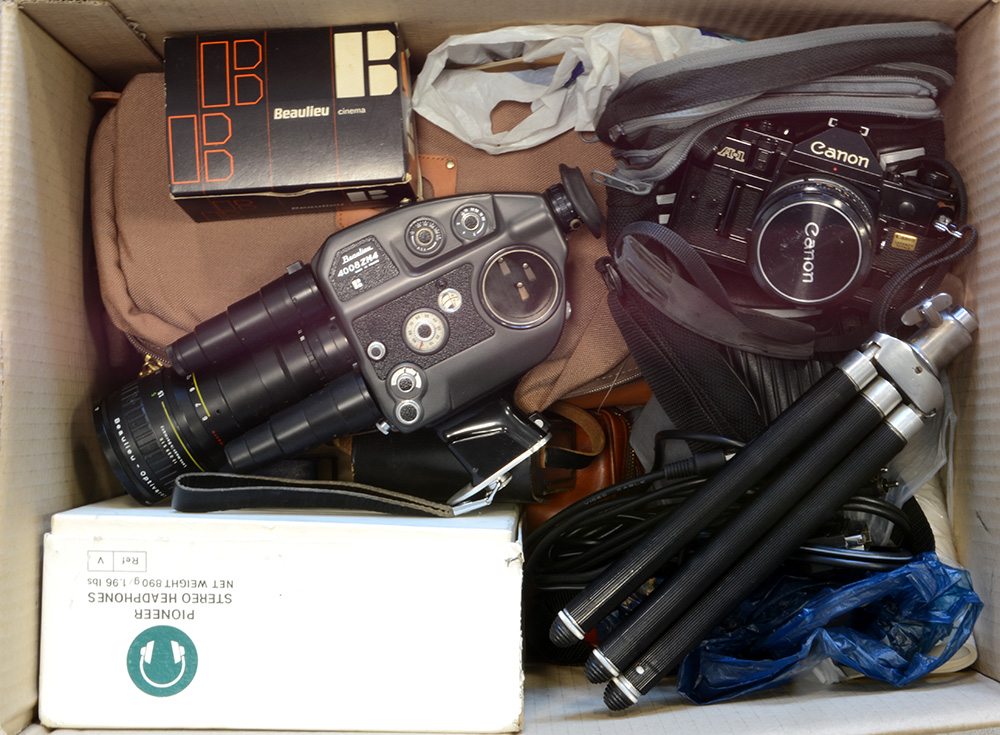 Cartone contenente cineprese, macchine fotografiche e ottiche (difetti)
