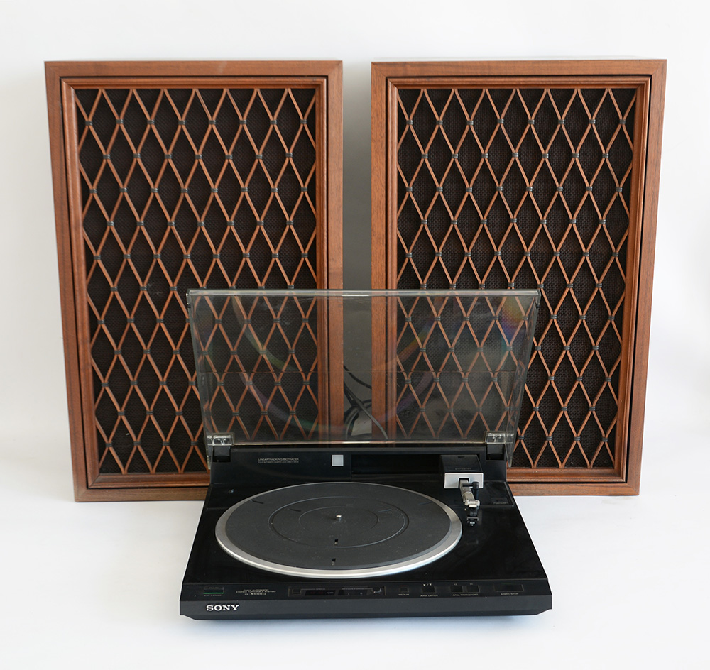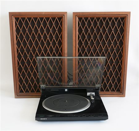 Lotto composto da un giradischi e due casse con struttura in legno (difetti)