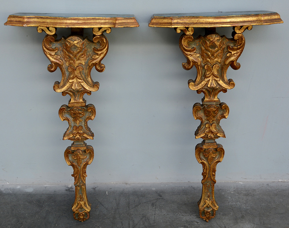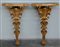 Coppia di piccole consolles in legno intagliato e dorato, piani laccati a finto lapislazzulo (cm 40x72x18) (difetti)