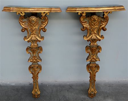 Coppia di piccole consolles in legno intagliato e dorato, piani laccati a...