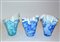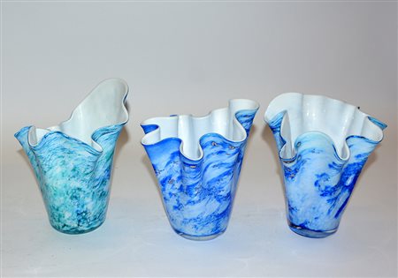 Lotto composto da tre vasi a fazzoletto in vetro a decoro marmorizzato nei toni del blu (h max cm 22)
