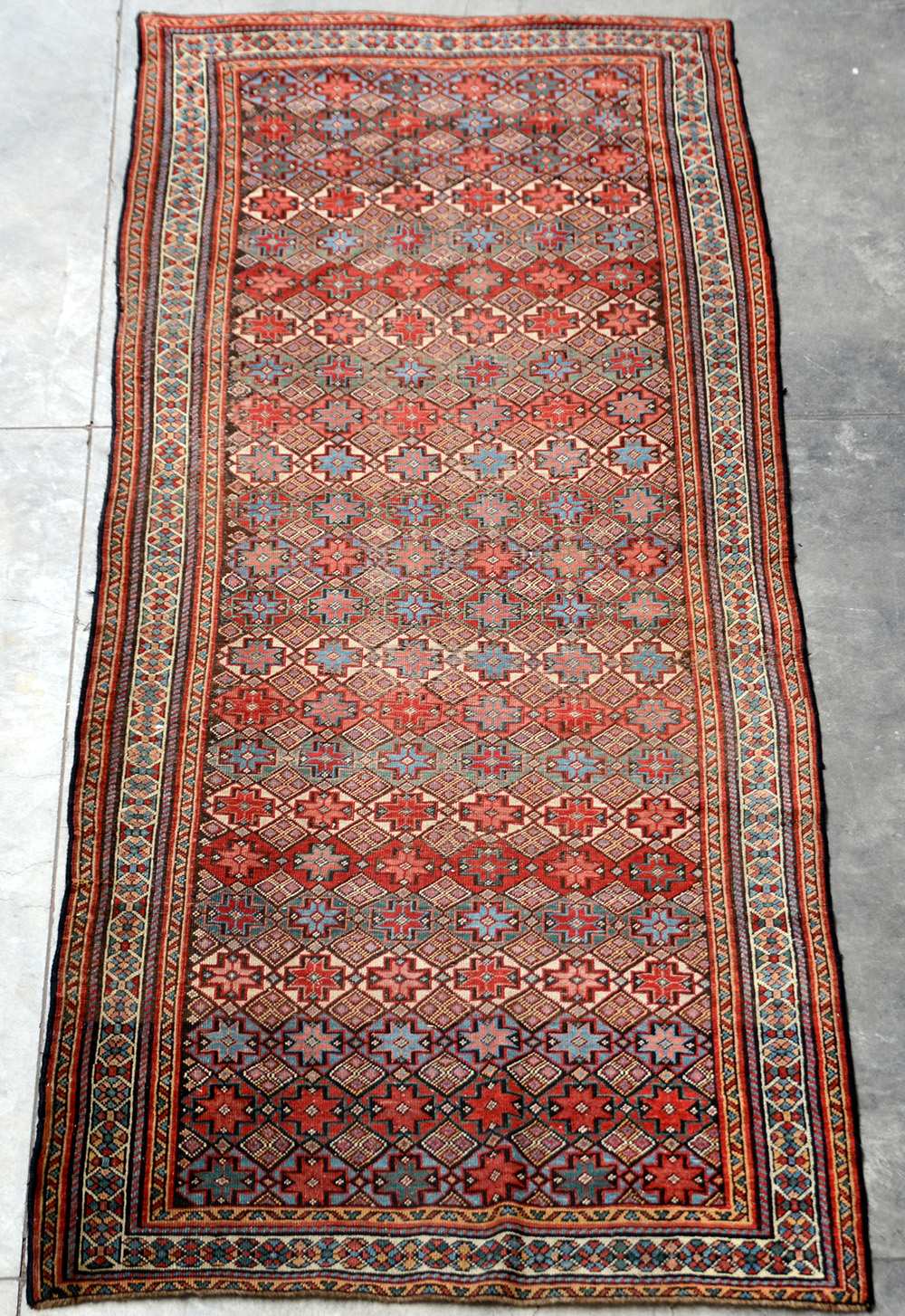 Tappeto Daghestan, Caucaso inizio secolo XIX. Decoro all over geometrico con file di stelline e recinti sacri in policromia su fondo marrone (cm 287x115) (difetti, restauri e mancanze)