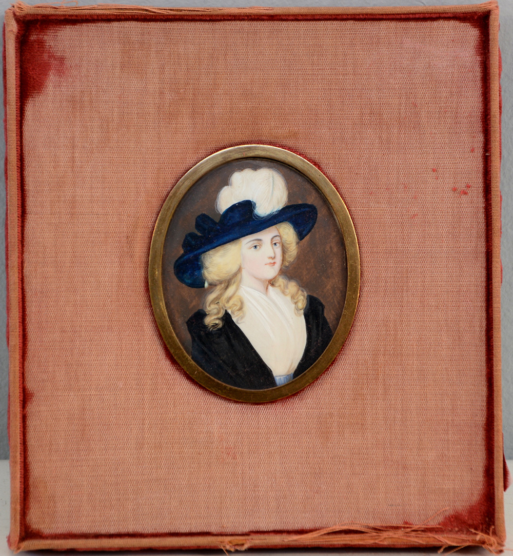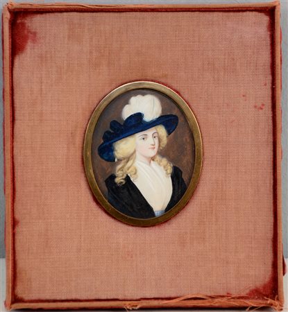 Scuola del secolo XIX "Ritratto di gentildonna con cappello piumato" miniatura ovale su avorio (cm 7x5,5) Timbro a ceralacca a retro (difetti)