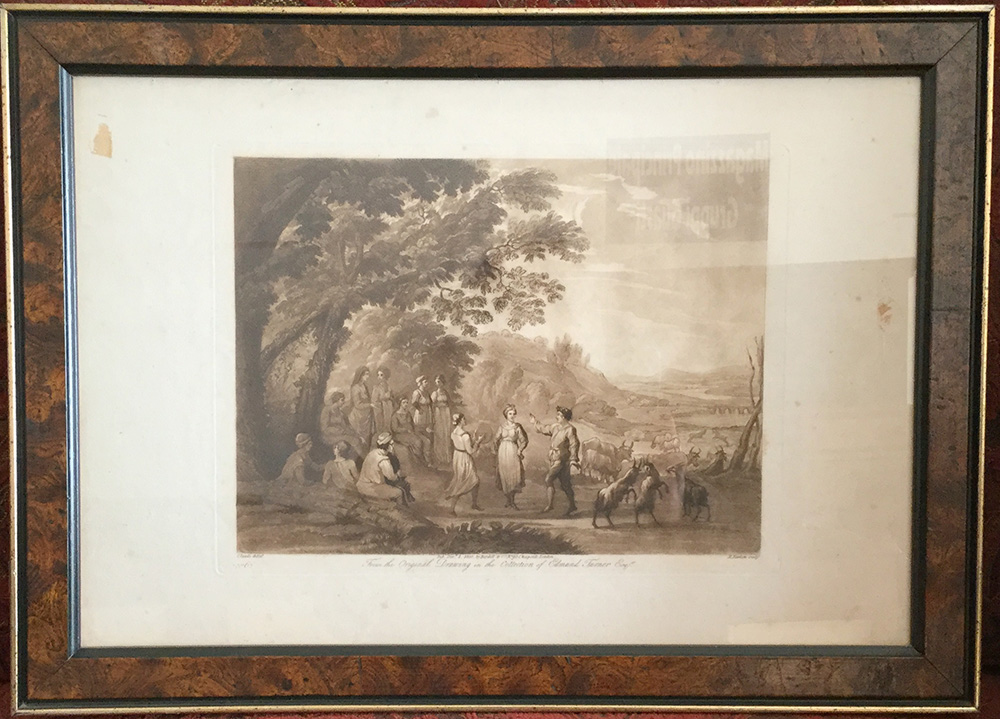 Acquatinta del sec. XIX raffigurante paesaggio con figure e animali, in cornice