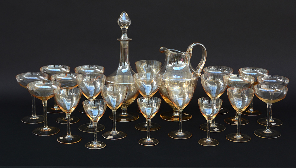 Parte di servizio di bicchieri in cristallo color pagliesco composto da undici coppe, quattro calici per acqua e otto per vino, una brocca e una bottiglia (difetti)