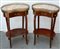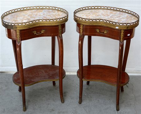 Coppia di tavolini a fagiolo, lastronati e intagliati in legni vari e guarnizioni in metallo. Con cassetto sottopiano, gambe sagomate e piano in marmo (cm 45x79x28)