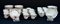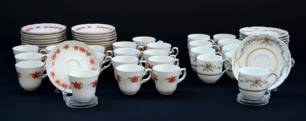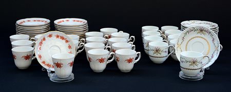 Parte di servizio da caffè in porcellana bianca decorata in policromia a fiori composta da ventisei tazzine e venticinque piattini, manifattura tedesca; unita ad una parte di servizio di tazzine da caffè in porcellana bianca con fiori, manifattura francese composto da undici tazzine con piattino (difetti)