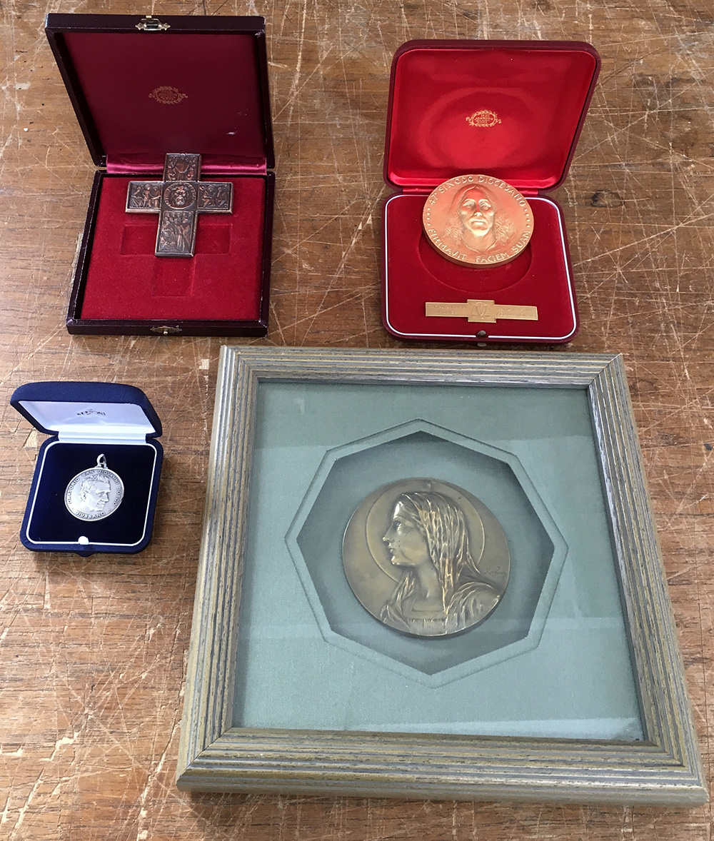 Lotto composto da quattro placche e medaglie di soggetto religioso di cui tre in custodia e una in cornice (difetti)