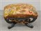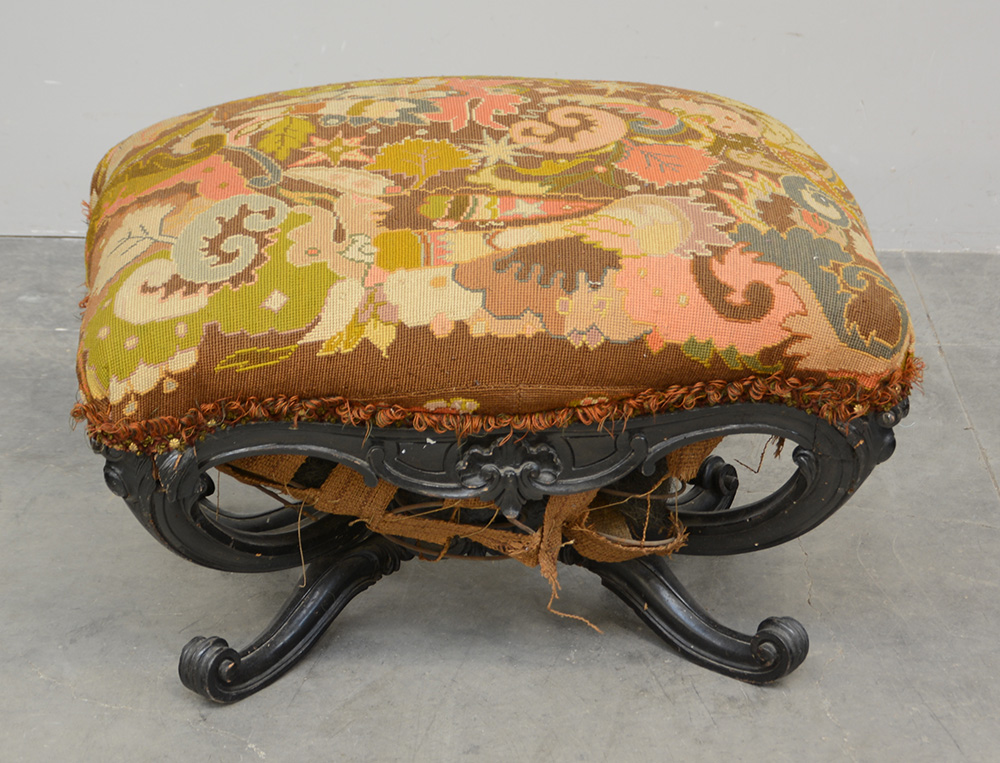 Panchetto con gambe mosse in legno intagliato e seduta rivestita in tessuto operato (cm 72x44x56) Secolo XIX (difetti)