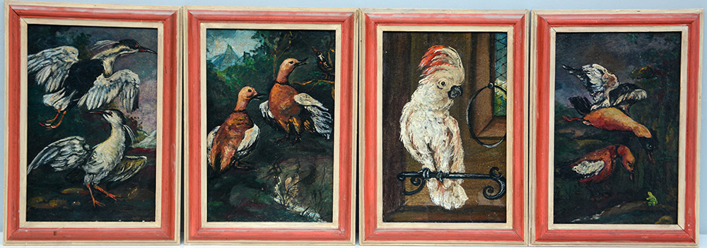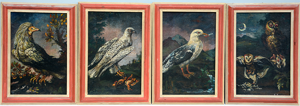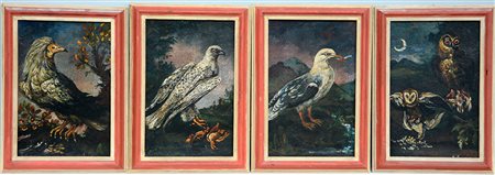 Scuola del secolo XX, otto dipinti ad olio su cartone raffiguranti "Uccelli"...