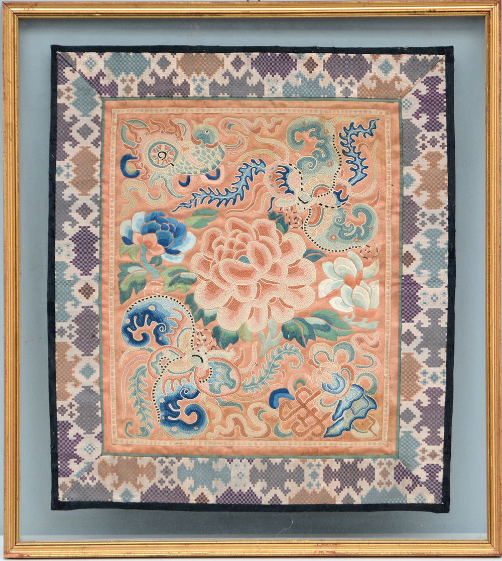Ricamo in seta, Cina fine secolo XIX.Raffigurante al centro una peonia con pipistrelli e rami fioriti nei toni elrosa, beige, azzurro e verde (cm 39x33,5) bordati da vecchio tessuto in seta. In cornice (lievi difetti)