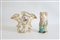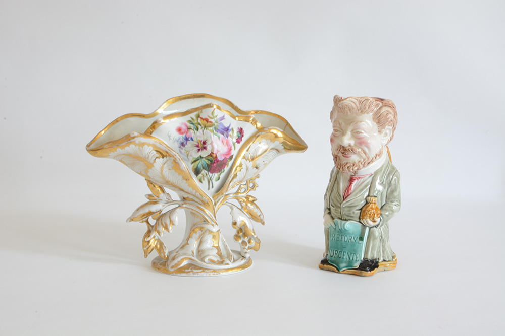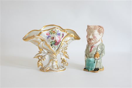 Lotto composto da una fioriera in porcellana policroma di inizio secolo XX e un versatoio con figura caricaturale (h max cm 28) (difetti e restauri)