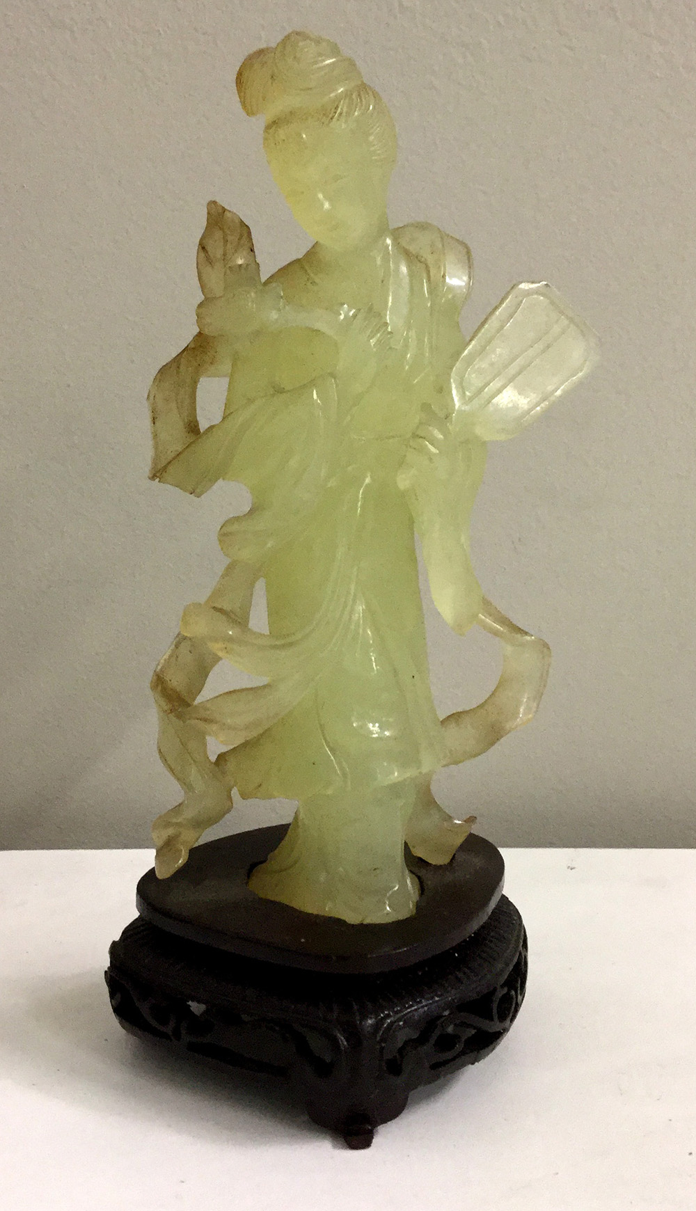 Scultura in pietra dura raffigurante una dama dalle lunghe vesti. Cina, secolo XX (h cm 16,5) base in legno (lievi difetti)