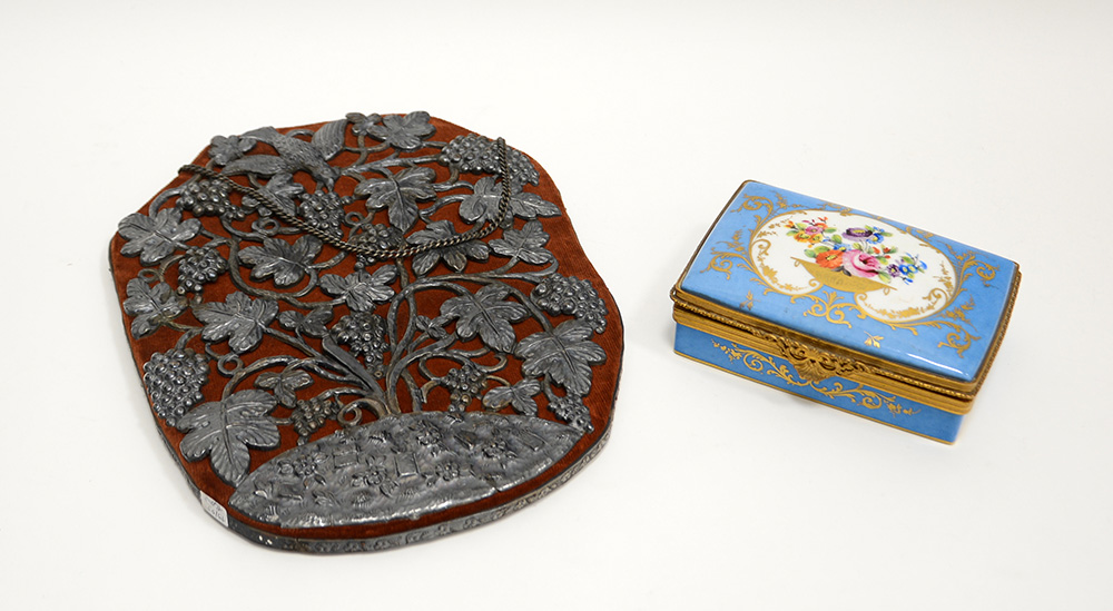 Lotto composto da una specchiera con cornice a decori naturalistici in metallo argentato e un cofanetto in porcellana di limoges (lievi difetti)