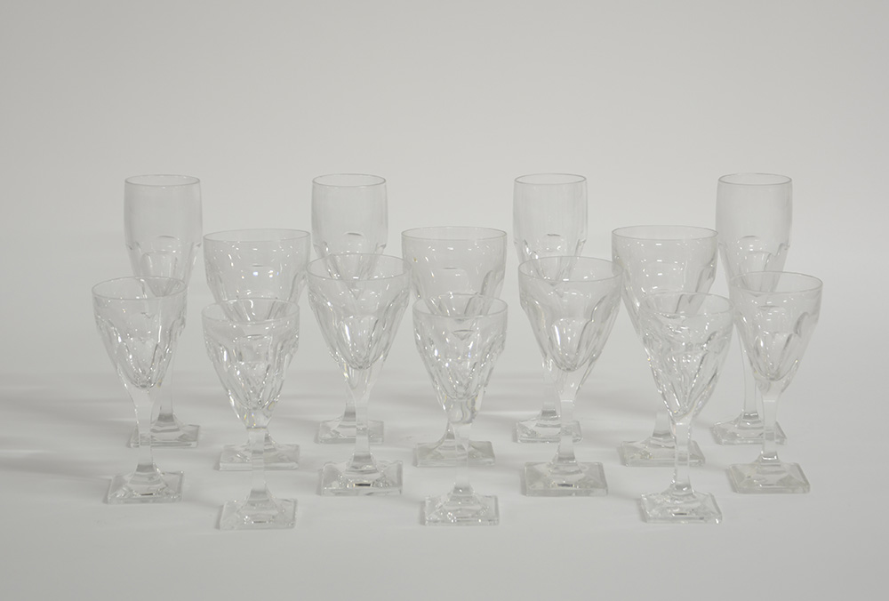 Servizio di bicchieri in cristallo incolore, molato con piede quadrato, composto da circa quaranta bicchieri (difetti)