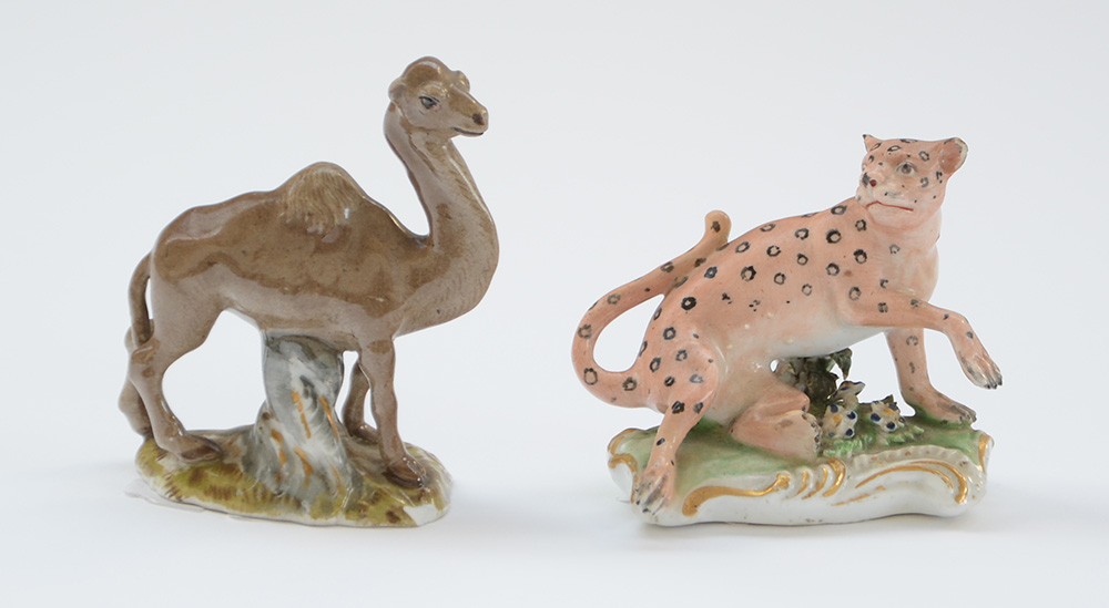 Manifattura di Meissen, secolo XIX. Piccolo gruppo in porcellana raffigurante cammello (cm 7). Unito ad uno di manifattura diversa raffigurante tigre (difetti)