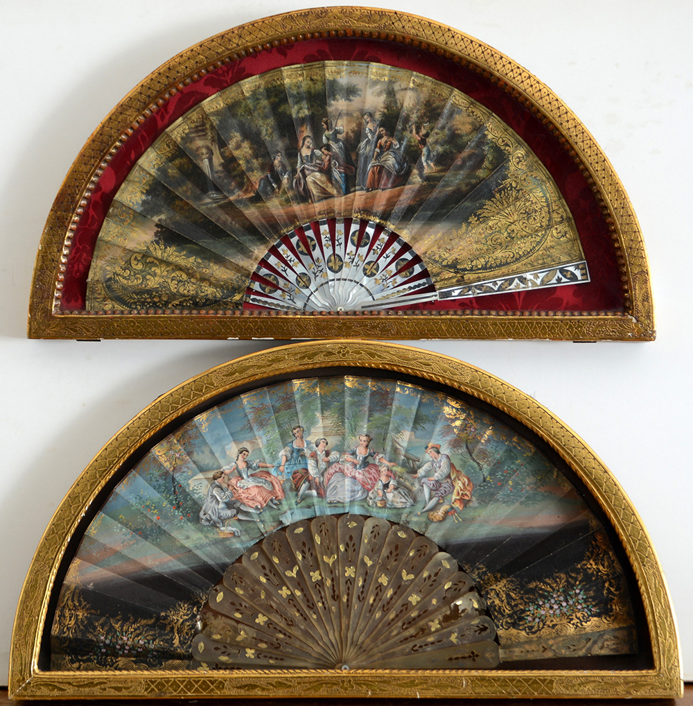 Lotto di due ventagli con pagine decorate da scene galanti. Entro teche sagomate (difetti)