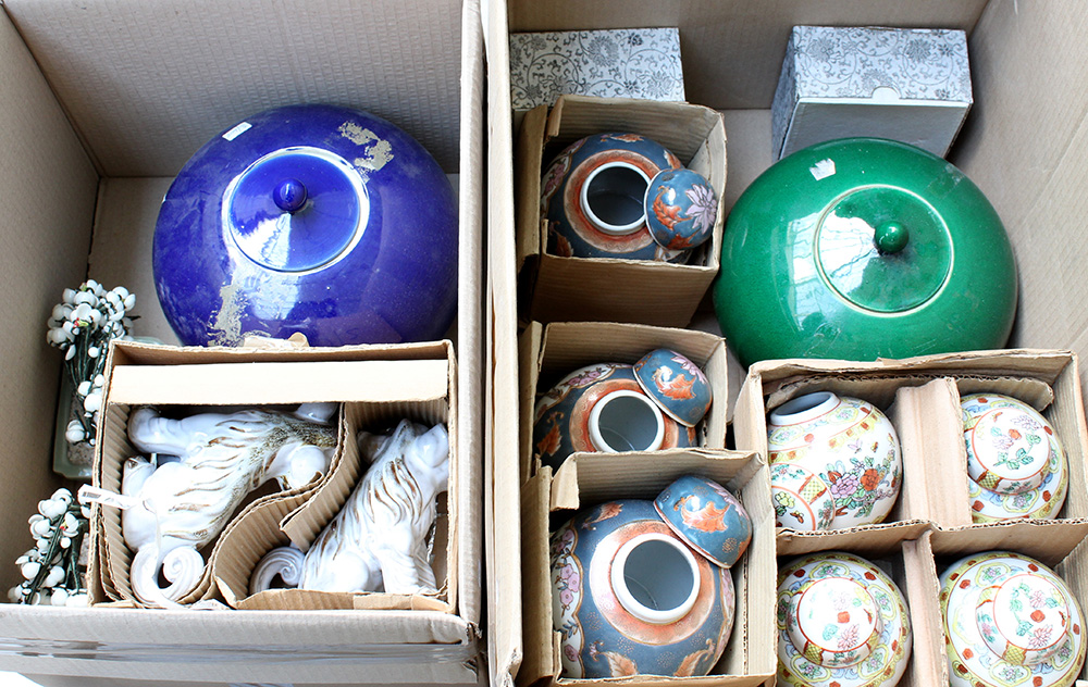Due cartoni contenenti una poutiche blu e una verde, quattro leoni buddisti in porcellana, otto potiche gialle e quattro con decoro floreale, due piante in vetro bianco e due ciotole in pietra dura (difetti)