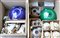 Due cartoni contenenti una poutiche blu e una verde, quattro leoni buddisti...