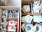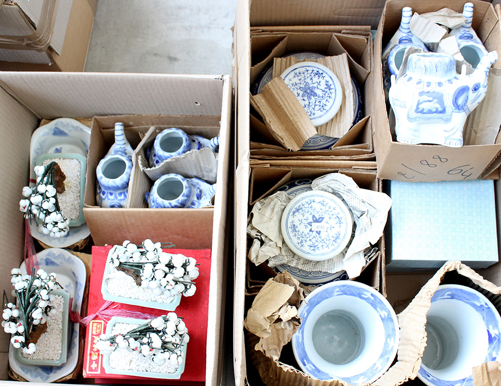Due cartoni contenenti due potiches, otto vassoi, due vasi e sei teiere in porcellana bianca e blu, due servizi da sake, otto uova dipinte in vetro e quattro piante bianche in vetro