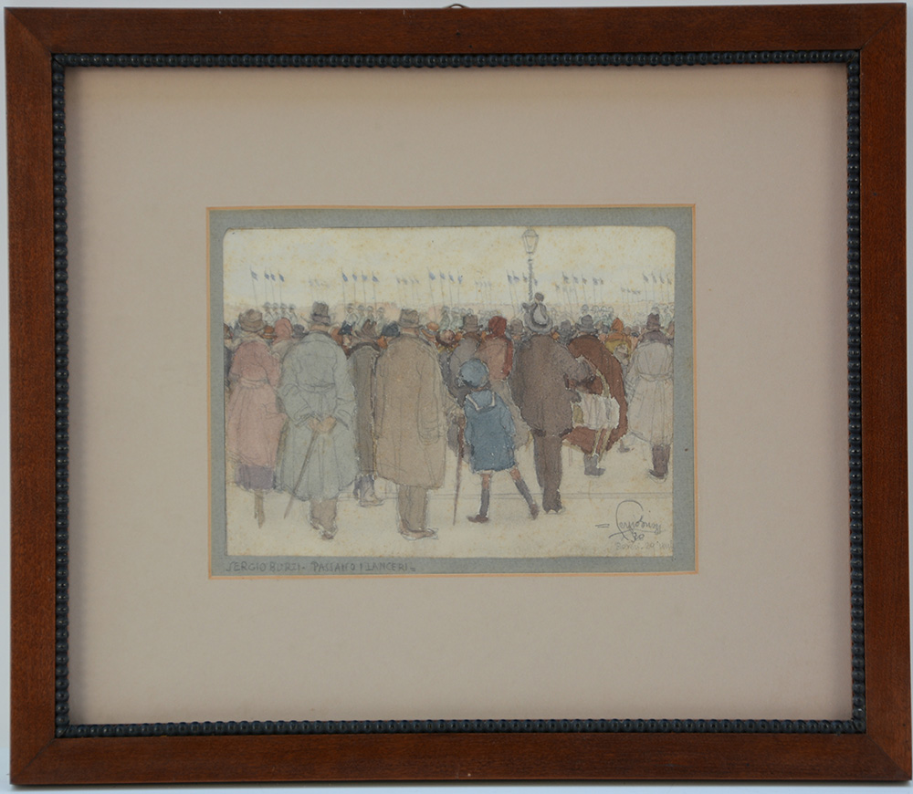 “Passano i lancieri”, matita e acquerello su carta (cm 13x17 circa) firmato e datato ‘30 in basso a destra, in cornice (difetti)