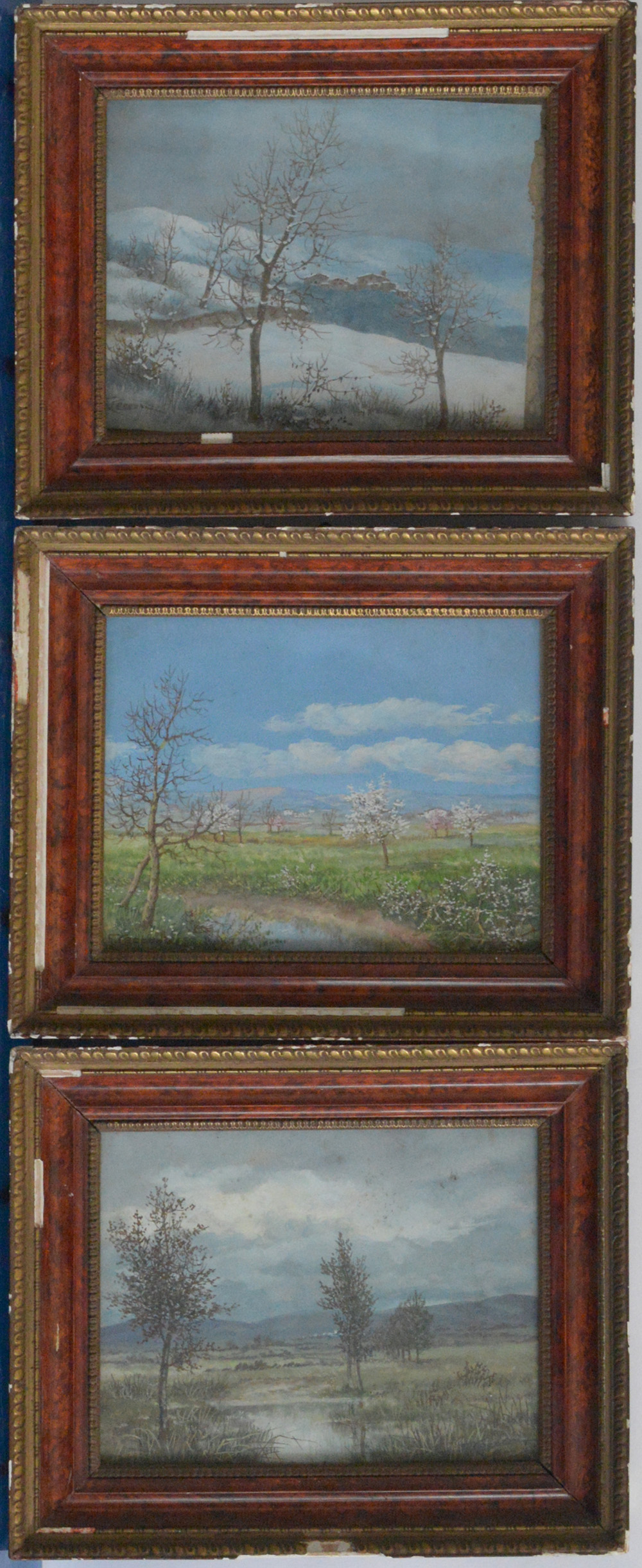 G. Cecconi - Lotto di tre tempere su cartoncino raffiguranti paesaggi, firmati in basso (cm 17x21), in cornici (lievi difetti)
