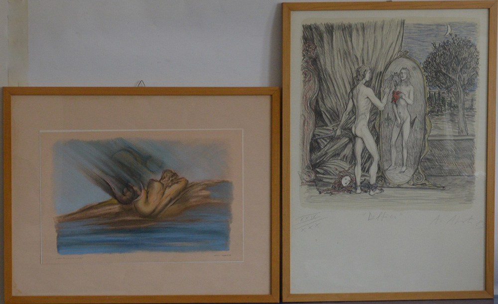 Lotto da un'opera a matita e pastelli a cera e una litografia, di autori e...